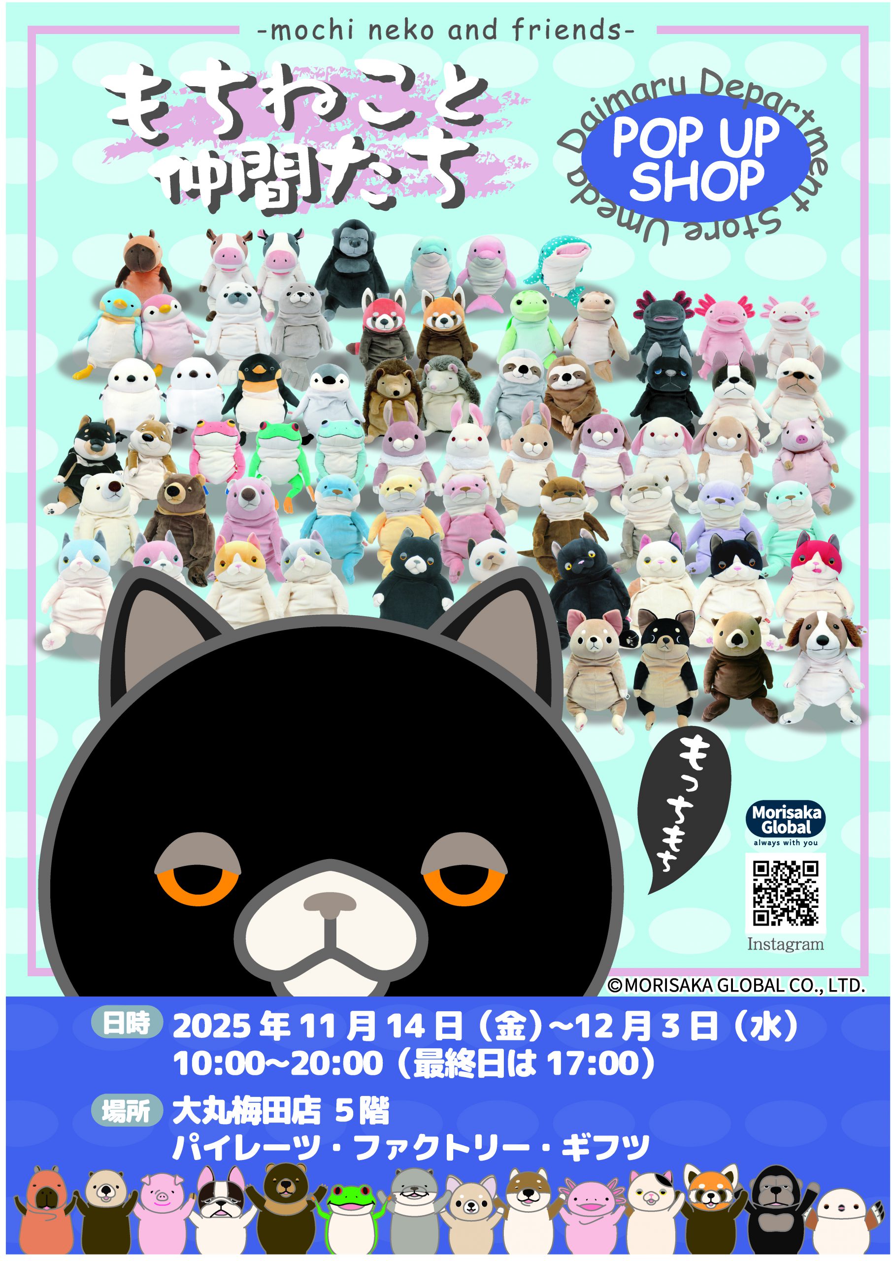 11/14(金) もちねこと仲間たちPOP UP SHOP in大丸梅田店5F パイレーツ・ファクトリー・ギフツ 期間限定オープン! 2025年11月7日 EVENT 『もちねこと仲間たち POP UP SHOP』 in大丸梅田店5F パイレーツ・ファクトリー・ギフツ 期間限定オープン! 2025年11月14日(金)~12月3日(水)の期間で開催いたします。 【イベント概要】 実施期間: 2025年11月14日(金)〜2025年12月3日(木) 販売場所:〒530-8202 大阪府大阪市北区梅田3-1-1 大丸梅田店 5階 パイレーツ・ファクトリー・ギフツ内 営業時間: 10:00~20:00 ※最終日のみ17:00閉場 皆さまのご来店を心よりお待ちしております! この記事をシェアする